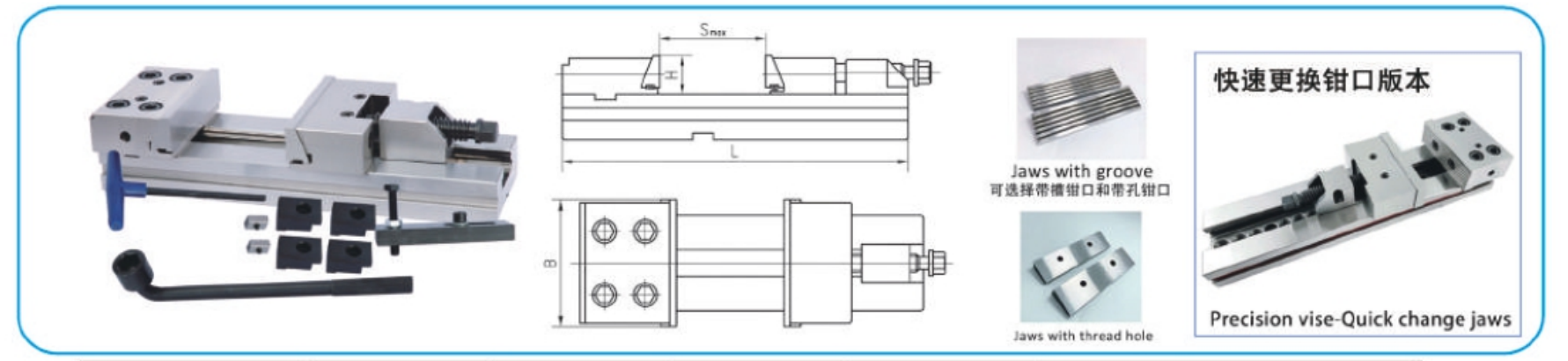 Precision modular vise jaw type: flat jaws, v groove jaws, thread hole jaws.
